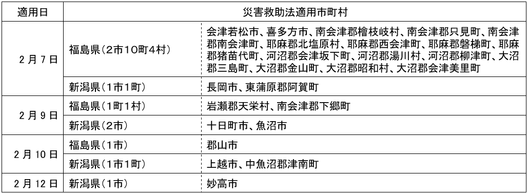 本日時点での特別措置の対象地域については、災害救助法が適用された市町村(2月12日時点:8市13町5村)に適用します。