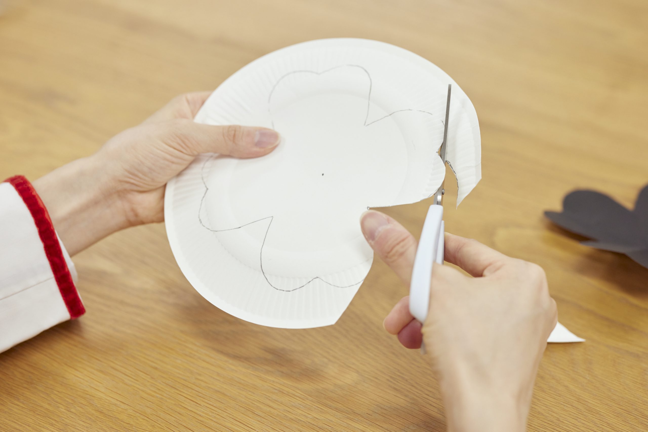 - ①型紙で紙皿にえんぴつで縁取り