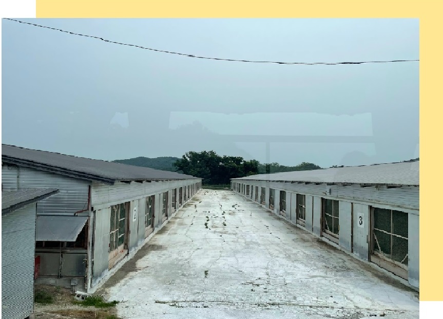 鶏舎の床部分と基礎部分の床下3cmほどは白くなっていました(写真下)。これは消毒用の石灰。粉だと風で飛んで行ってしまうため、水で溶かした石灰を散布しています。