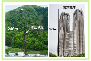 笛吹川水系で一番大きな発電所である柚ノ木発電所は、18,100㎾という高い発電能力を持っています。柚ノ木発電所の水圧鉄管の高さは、なんと246m・・・!東京都庁とほぼ同じ高さです。