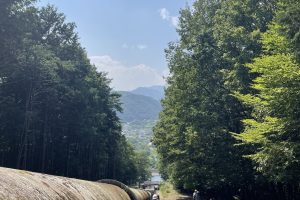 柚ノ木発電所の構造をご説明していただいた後に、先程ご紹介した246mの水圧鉄管を見学させていただきました。鉄管路の脇にある急な階段を、息を切らしながら途中にある橋まで登りました。途中まででも足が震えるほど高く、階段を登るだけでもとても大変でした。企業局の皆さんは、設備点検のために月に一度頂上まで登っているそうです。