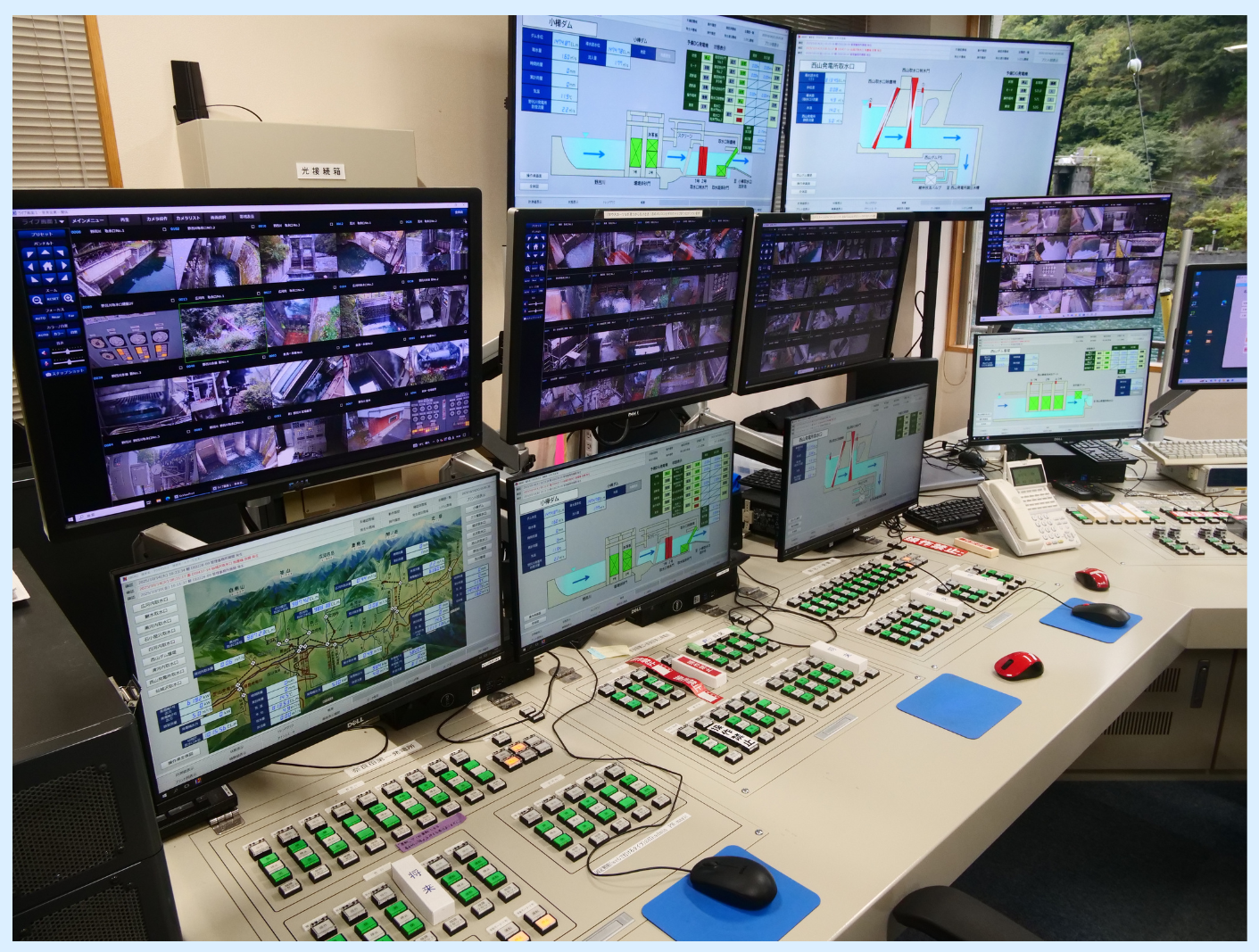 取水口監視所にはたくさんのモニターとボタンがありました。マウス操作でカメラを動かすことが可能で、各取水口を詳細に監視することができます。